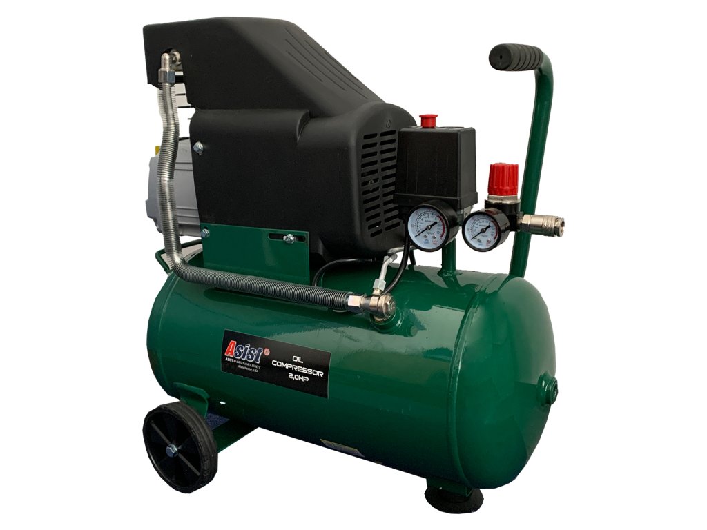 Olejový kompresor Asist s příkonem 1500W . Tento kompresor pracuje s tlakem až 8 bar a dodává až 198 litrů vzduchu za minutu. Je vhodný jako přívod stlačeného vzduchu pro zařízení na huštění pneumatik, ofukovací pistole, nanášení barev apod.