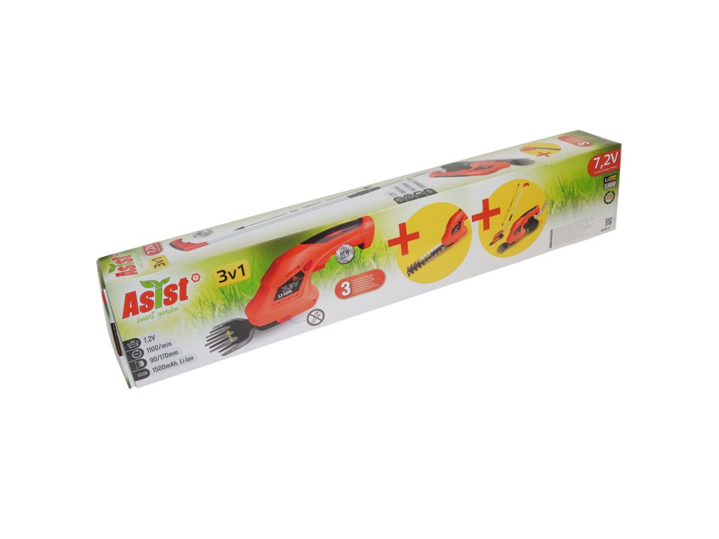 AKU zahradní nůžky ASIST SMART GARDEN AE3N72T jsou vhodné pro péči o trávu, živé ploty a křoviny na vaší zahradě i okolo vašeho domu. Jsou osazeny 7,2 V Li-Ion akumulátorem s kapacitou 1500 mAh. Na jedno nabití zvládnou pracovat cca 45 minut. Pracovní záběr lišty na trávu činí 90 milimetrů a lišty na dřeviny je pak 170 milimetrů. Pomocí těchto nůžek si výrazně zjednodušíte a zkvalitníte práci s živým plotem, nebo okrasnými křovinami.