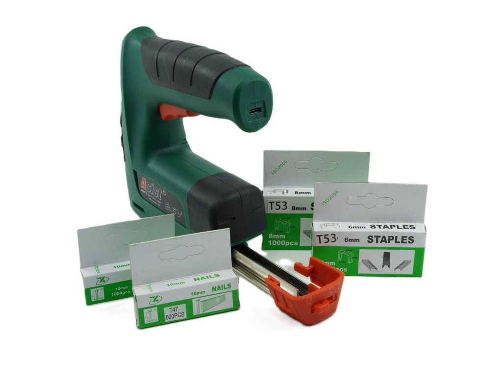 1 x nabíječka 2000ks spon (1000x6mm + 1000x8mm) 1000ks hřebíků 10mmDoplňkové parametry