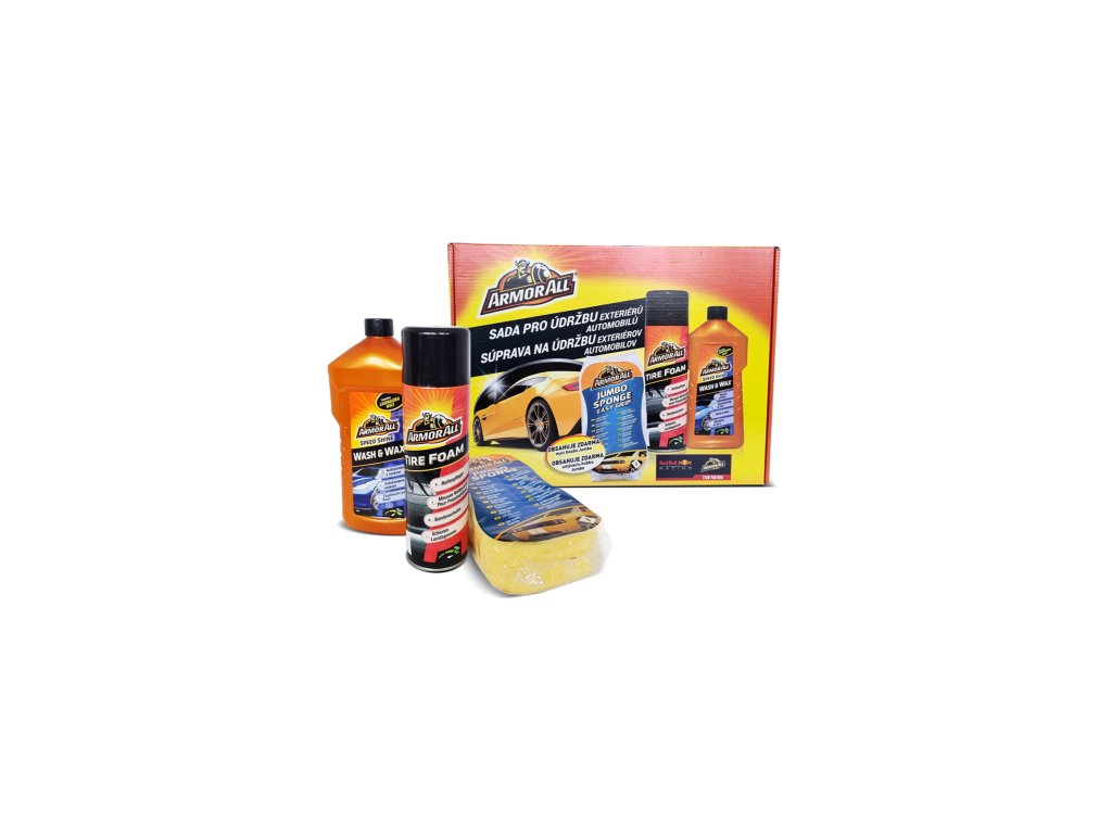 Kompletní sada Armor All pro dokonalou péči o exteriér vozu. Obsahuje šampon s voskem Wash & Wax, pěnu na pneumatiky Tire Foam a velkou JUMBO houbu. Umožňuje umýt, ošetřit i ochránit lak i pneumatiky jako v profesionální automyčce – přímo u vás doma.