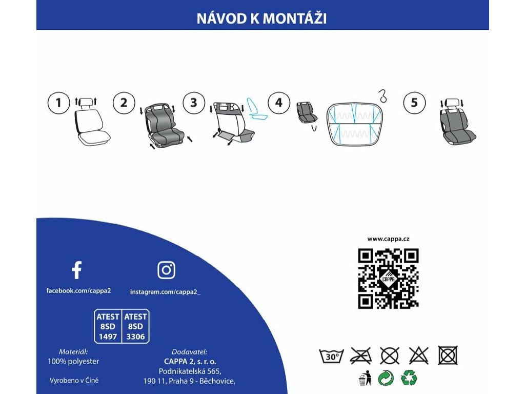 Tipy k použití: pro co nejlepší výsledek před prvním nasazením sedadla vysajte a potah navlékejte postupně od opěradla k sedáku. Perte naruby v jemném programu, nesušte v sušičce. Má-li vůz boční airbagy v sedadlech, před použitím ověřte kompatibilitu potahů s tímto prvkem.