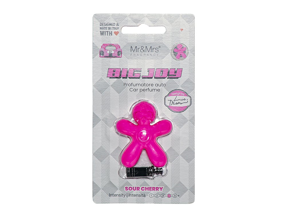 Big Joy je osvěžovač vzduchu do auta, který navrhl Luca Trazzi ve sportovním, popovém a barvitém duchu. Je vyroben z EVA - termoplastického polymeru (měkké pryže) a při kontaktu se vzduchem vypouštěným ventilačním otvorem automobilu uvolňuje příjemnou vůni. Velice atraktivní design ve tvaru panáčka Vyrobeno z termoplastického polymeru (měkké pryže) Tóny třešně, hřebíčku, vanilky, bílého pižma, santalového dřeva a šedého jantaru. Vyhlášený italský design Prestižní certifikát IFRA Zdravotní nezávadnost Uvolňuje vůni až 50 dní Rozměry: 4,5 x 5,5 cm Upevnění do výdechu klimatizace.
