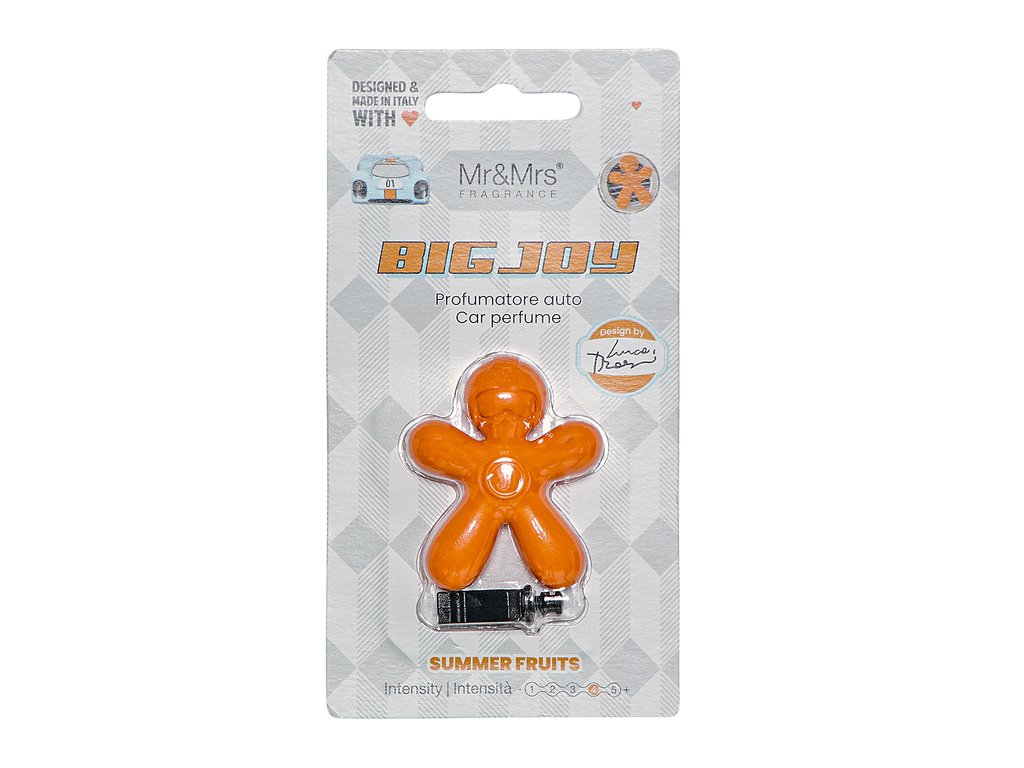 Big Joy je osvěžovač vzduchu do auta, který navrhl Luca Trazzi ve sportovním, popovém a barvitém duchu. Je vyroben z EVA - termoplastického polymeru (měkké pryže) a při kontaktu se vzduchem vypouštěným ventilačním otvorem automobilu uvolňuje příjemnou vůni. Velice atraktivní design ve tvaru panáčka Vyrobeno z termoplastického polymeru (měkké pryže) Tóny pomeranče, jablka, melounu, melounu, broskve, růže, pižma. Vyhlášený italský design Prestižní certifikát IFRA Zdravotní nezávadnost Uvolňuje vůni až 50 dní Rozměry: 4,5 x 5,5 cm Upevnění do výdechu klimatizace.