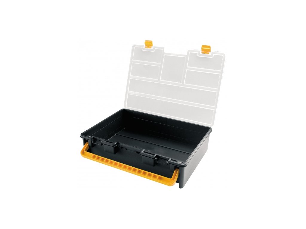 Plastový organizér 443 x 317 x 107 mm, s průhledným víkem Řada malých kufříkových přihrádek na nářadí ze série VALENTINO nabízí širokou škálu velikostí a modelů. Všechny organizery jsou vybaveny průhlednými protinárazovými víky