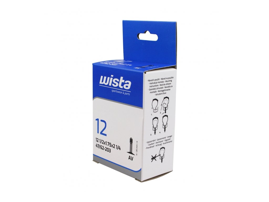 Cyklo duše WISTA jsou velmi odolné proti průrazu a udržují stálý tlak po dlouhou dobu. Použitím duší WISTA předcházíte defektům a také snižujte riziko úbytku tlaku. Nižší hmotnost navíc zlepšuje jízdní vlastnosti. Materiál: vyrobeny z vysoce kvalitního butylového kaučuku Technický popis: udržují stálý tlak po dlouhou dobu velmi odolné proti průrazu rozměr 12 1/2x1,75x2 1/4 rozměr 47/62-203 auto ventilek AV 35 mm