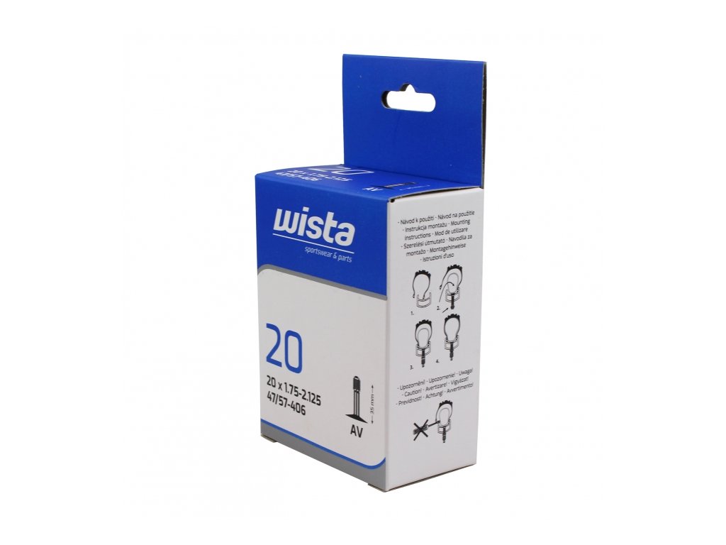 Cyklo duše WISTA jsou velmi odolné proti průrazu a udržují stálý tlak po dlouhou dobu. Použitím duší WISTA předcházíte defektům a také snižujte riziko úbytku tlaku. Nižší hmotnost navíc zlepšuje jízdní vlastnosti. Materiál: vyrobeny z vysoce kvalitního butylového kaučuku Technický popis: udržují stálý tlak po dlouhou dobu velmi odolné proti průrazu rozměr 20x1,75-2,125 rozměr 47/57-406 auto ventilek AV 35 mm