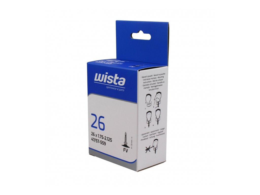 Cyklo duše WISTA jsou velmi odolné proti průrazu a udržují stálý tlak po dlouhou dobu. Použitím duší WISTA předcházíte defektům a také snižujte riziko úbytku tlaku. Nižší hmotnost navíc zlepšuje jízdní vlastnosti. Materiál: vyrobeny z vysoce kvalitního butylového kaučuku Technický popis: udržují stálý tlak po dlouhou dobu velmi odolné proti průrazu rozměr 26x1.75-2.125 rozměr 47/57-559 galuskový ventilek FV 33 mm