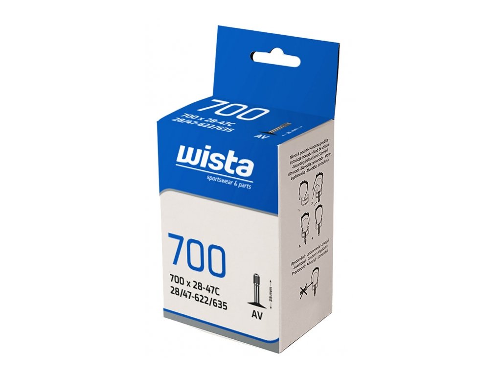 Cyklo duše WISTA jsou velmi odolné proti průrazu a udržují stálý tlak po dlouhou dobu. Použitím duší WISTA předcházíte defektům a také snižujte riziko úbytku tlaku. Nižší hmotnost navíc zlepšuje jízdní vlastnosti. Materiál: vyrobeny z vysoce kvalitního butylového kaučuku Technický popis: udržují stálý tlak po dlouhou dobu velmi odolné proti průrazu rozměr 700x28-47 C rozměr 28/47-622/630/635 auto ventilek AV 35 mm