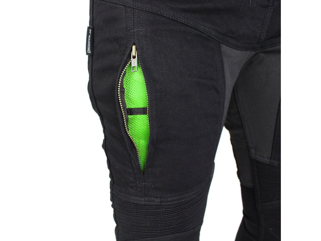 Střih a provedení kalhot je uzpůsobeno jízdě na motocyklu. Rozkrok je prodyšný a elastický pro komfort při sezení na sedle. Vysoký pas je spolu s koleny mírně elastický pro nejlepší padnutí. Nosit je můžete i v letním horku díky ventilačním panelům na stehnech.