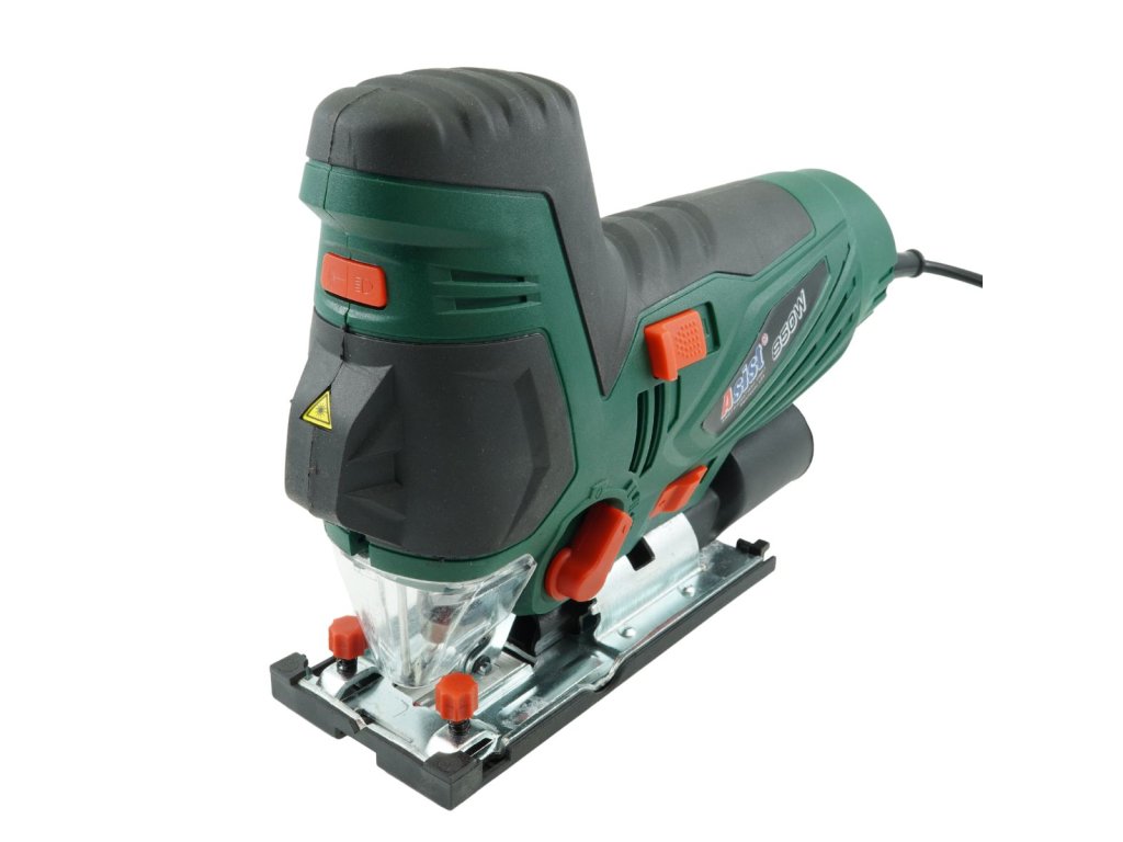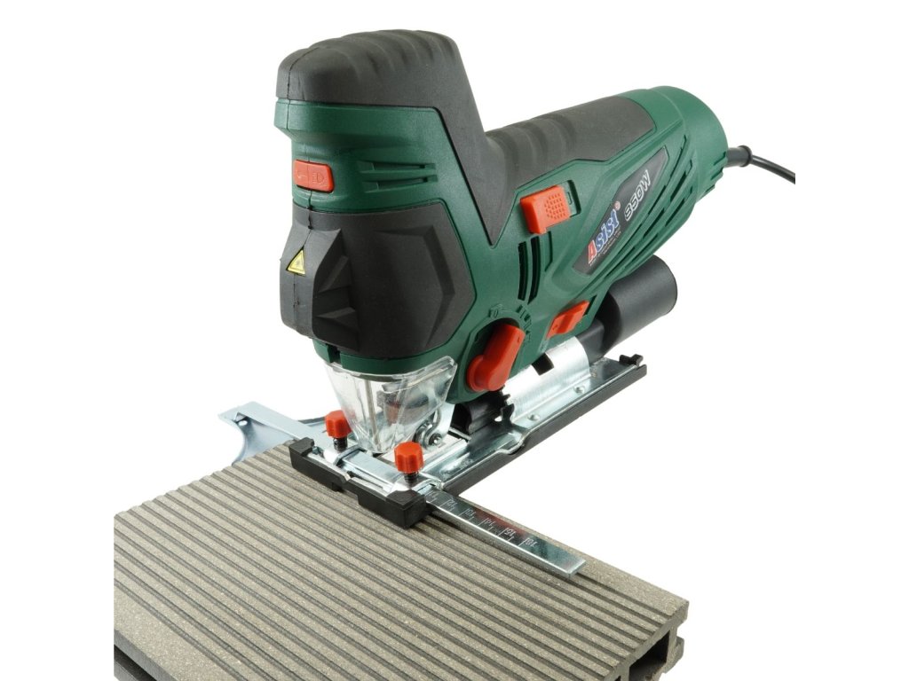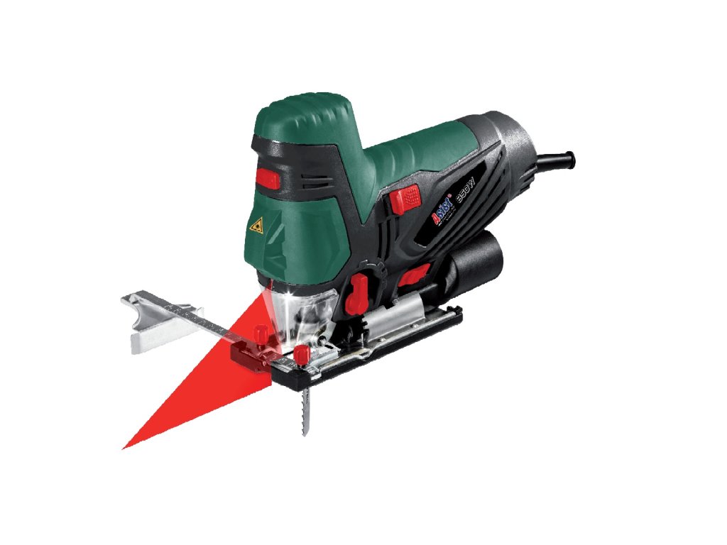 Elektrická přímočará pila s výkone 850W a s nastavitelným úhlem řezání a předkmitem. Může opracovávat ocel, plasty nebo i dřevěný materiál, podle použitého pilového listu. Regulace frekvence kmitání. Šikmý řez 0 - 45°. Železná základna.
