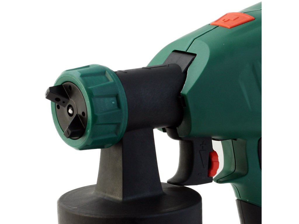 Elektrická stříkací pistole s regulací tvaru proudu a množství barvy. Nádržka na barvu má obsah 800ml. Rukojeť soft grip pro pohodlné držení i při déle trvající práci. vhodné na vodou i ředidlem ředitelné barvy, barvy na stěny na vodou a ředidlem ředitelné bary, laky, základy, dvojsložkové barvy, mořidla.