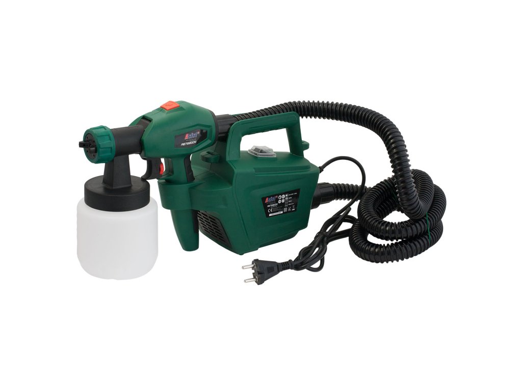 Elektrická stříkací pistole s regulací tvaru proudu a množství barvy. Nádržka na barvu má obsah 800ml. Rukojeť soft grip pro pohodlné držení i při déletrvající práci. vhodné na vodou i ředidlem ředitelné barvy, barvy na stěny na vodou a ředidlem ředitelné bary, laky, základy, dvojsložkové barvy, mořidla. Součástí je 1,8m dlouhá ohebná hadice, takže není nutno držet motor po celou dobu práce v ruce nebo zavěšený na rameni.