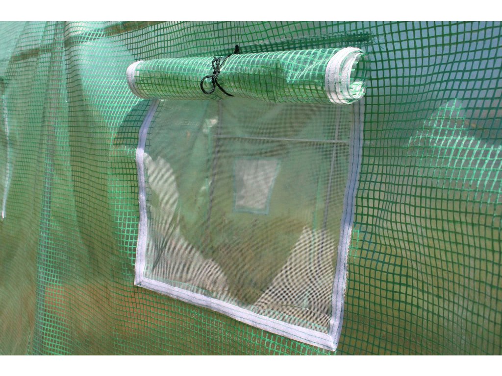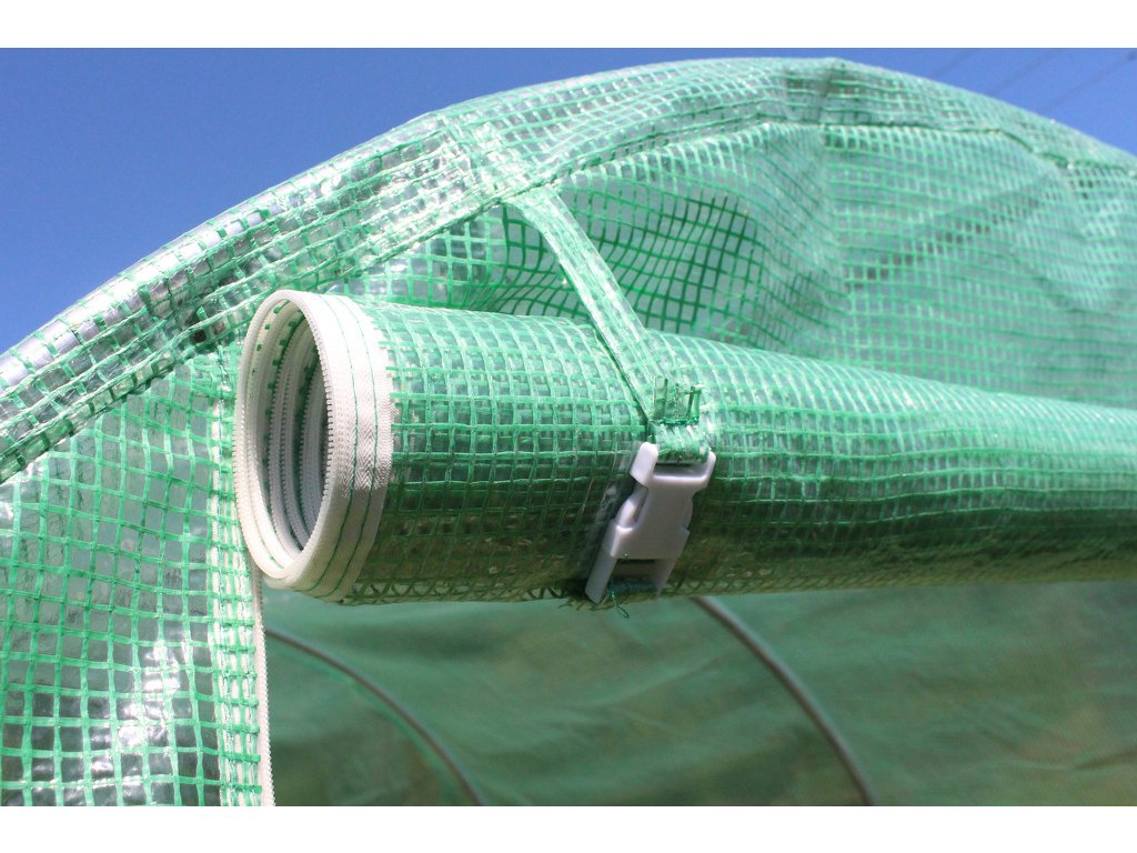 Uzavření vchodu je na zip, po otevření se dá srolovat a přezkami zajistit. Zároveň je fóliovník vybaven třemi okénky na každé straně, jejich otvory jsou zakryty síťkou.