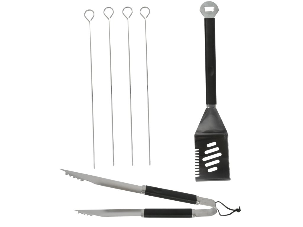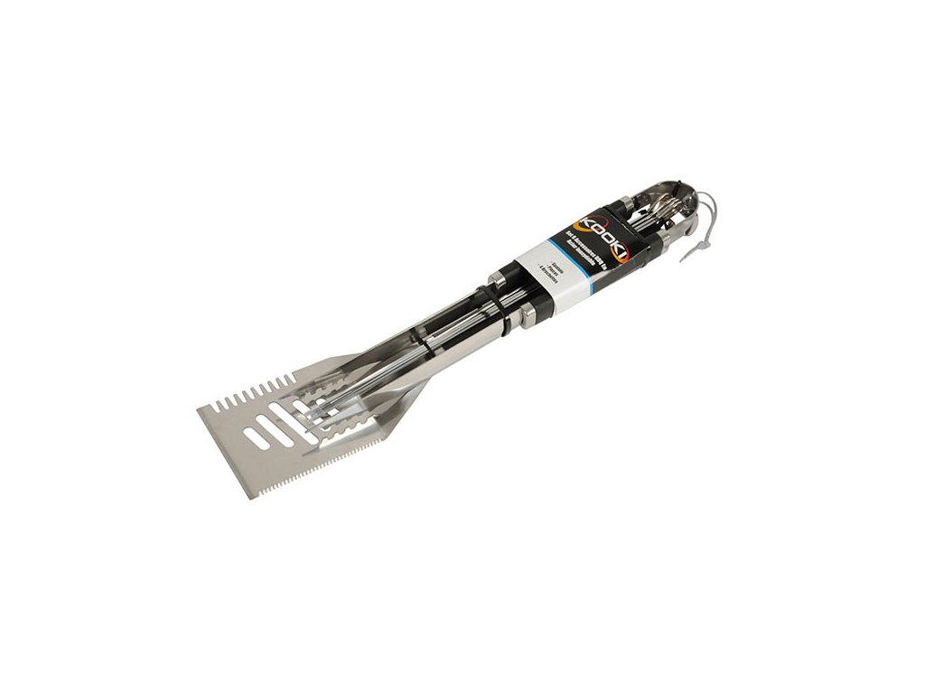 ** Grilovací sada ** se skládá z: * 1x špachtle s otvírákem a zoubky, k obracení a podebírání (délka 45 cm) * 4x vidlice (délka 38 cm) * 1x kleště (délka 38 cm)