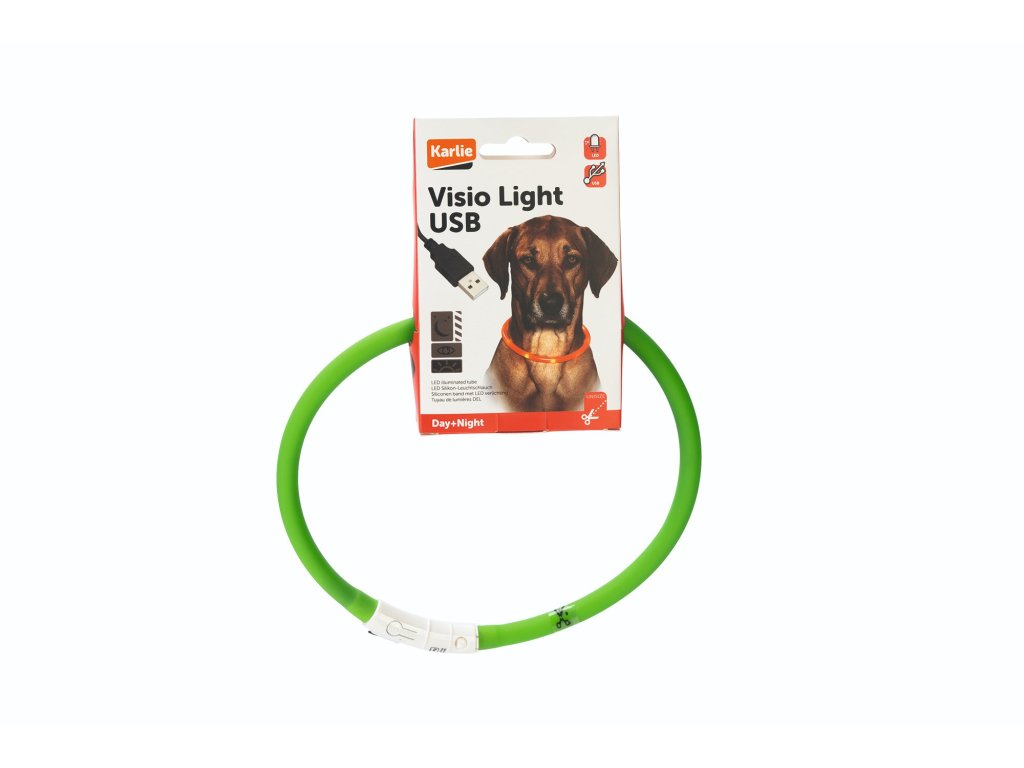 LED světelný obojek zelený viditelný až cca 500 m. Dobíjecí baterie pomocí USB kabelu - žádné jiné baterie nutné - voděodolná - blikající světlo nebo kontinuální světlo. Velikost 20-70 cm