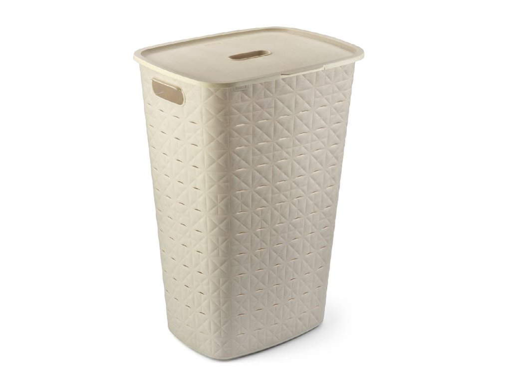 Koš na špinavé prádlo LAUNDRY HAMPER o objemu 56L, inspirovaný technikou tkaní a prošívání, díky drobným otvorům v textuře neustále větrá, stylový a praktický zároveň, vyroben z 70% recyklovaného plastu, pohodlná madla pro snadnou manipulaci, víko s úchytkou na zavěšení za okraj koše. Rozměry: 43,8 x 34 x 59,9 cm (š x d x v).