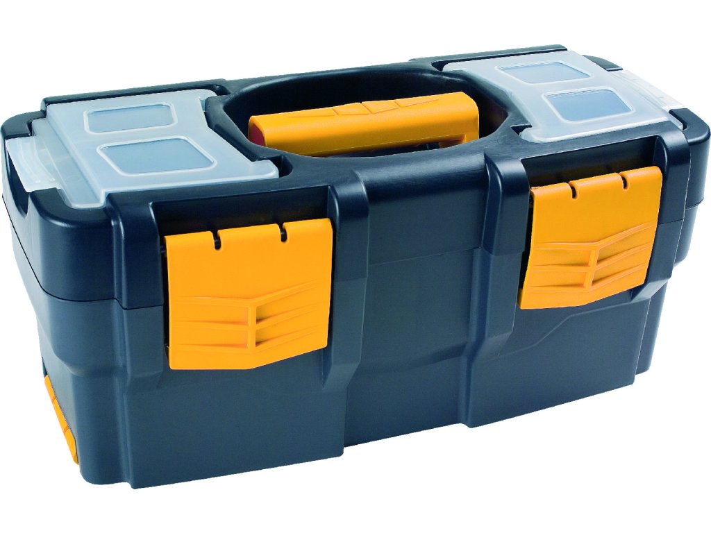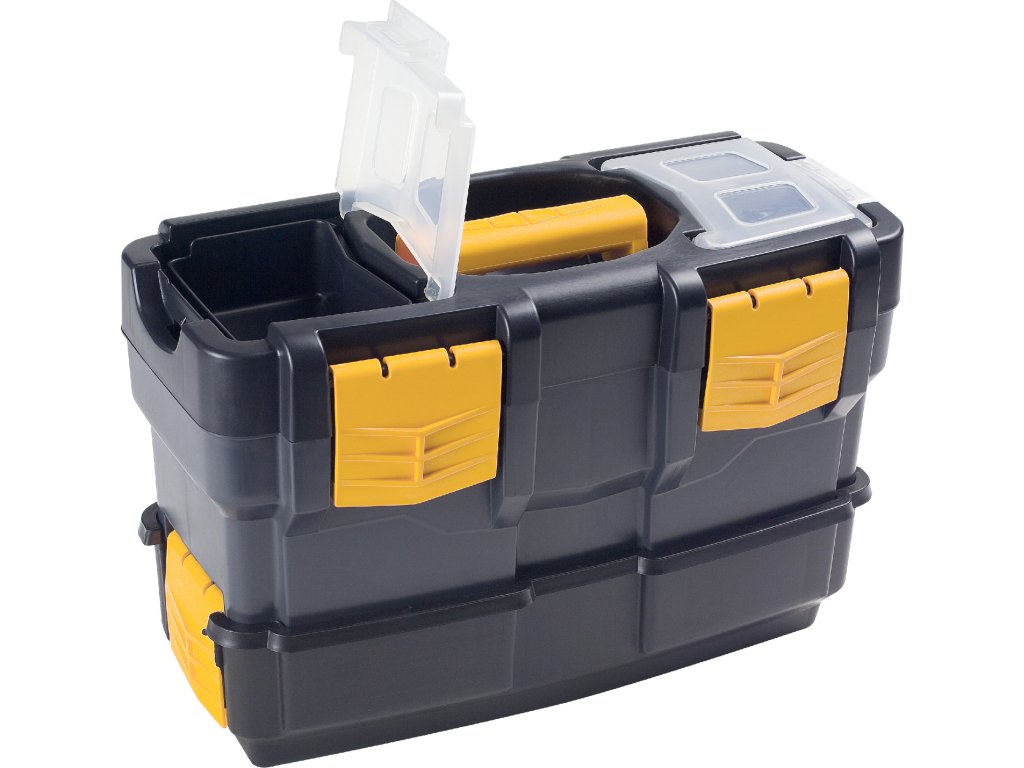 Kufr s přídavným boxem na nářadí.Boxy spojeny zaklapávacím mechanismem, možno používat odděleně. Vyrobeno z odolného plastu - polypropylenu odolné vůči olejům. Jedna vyjímatelná police, zásobníky na drobný materiál na vnější straně víka. Vnitřní rozměry: horní část: D 315 x Š 140 x V 115 mm; dolní část: D 300 x Š 130 x V 90 mm Vnější rozměry š x d x v (mm): 350 x 170 x 230 Materiál: plast