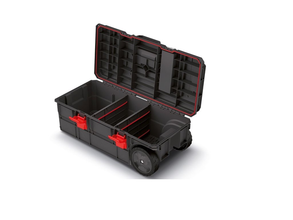 Základní vlastnosti: *odolná struktura s nosností do 50 kg, a v rámci tlaku do 120 kg *hliníkové lišty umožňující montáž tesařských svorek, což z krabice dělá kompaktní „pracovní stůl“ *těsnění zajišťuje odolnost proti prachu a vodě *transparentní organizér ve víku *2 rukojeti pro snadnější přenášení *rozměr 79,5 x 38 x 30,7 cm *teleskopická rukojeť *vnitřní rozdělovače