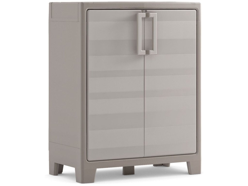 Skříň s 2 policemi o nosnosti 30 kg, stabilitu zajišťuje 5 nastavitelných nožiček, možnost dodatečného uzamčení, robustní kovové panty, vyrobena z propylenu velmi odolného proti chladu a nepříznivému počasí, olejům a rozpouštědlům, zvýšená odolnost proti nárazům, ideální do sklepa, garáže, dílny, na balkon, terasu či do chodby, rozměry skříně 80 x 44 x 100 cm, béžová/bílá