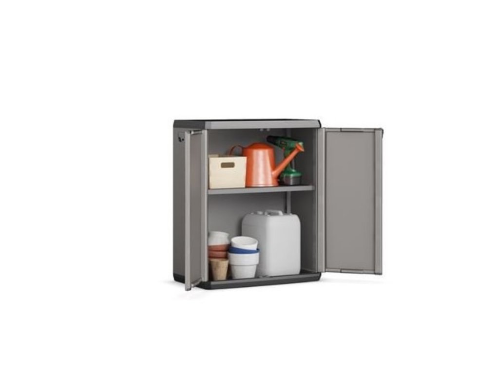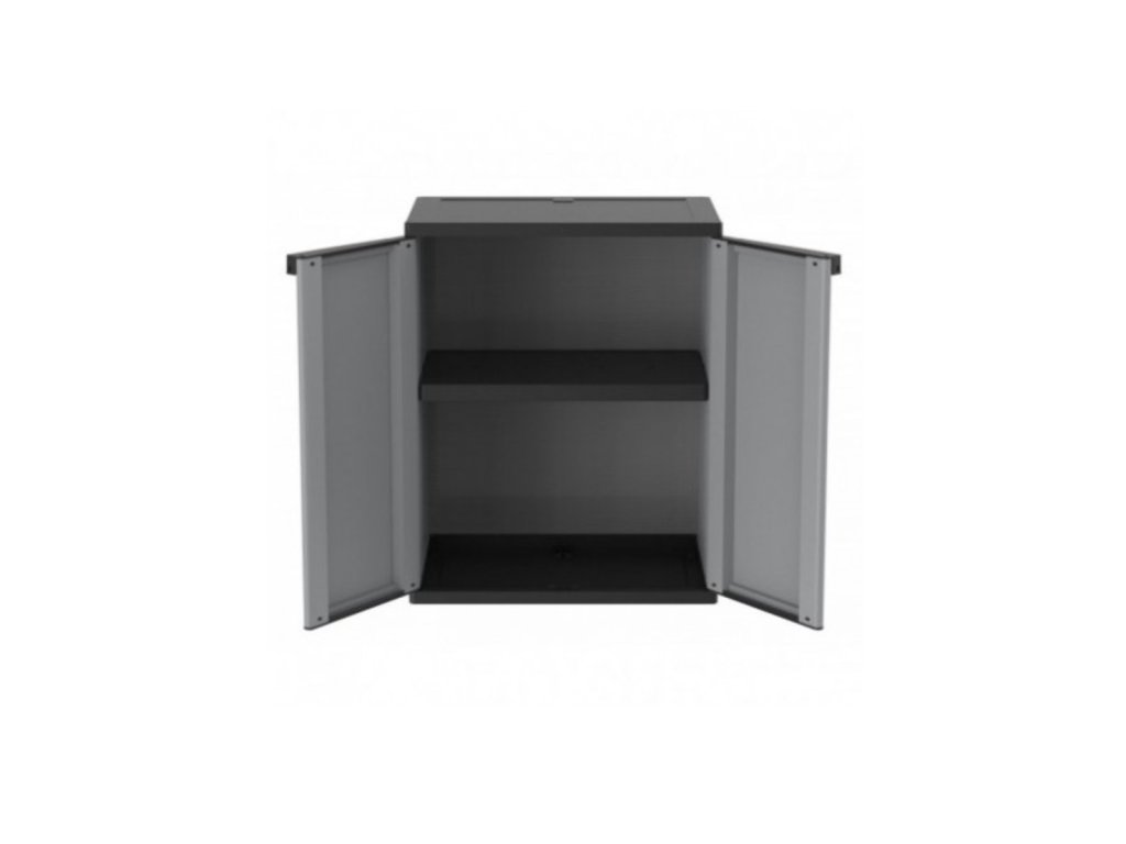Úložná skříň PIU nízká, robustní konstrukce, jednoduchý design, vyrobena z kvalitního plastu odolného vůči přírodním vlivům a UV záření, ergonomické rukojeti, uzamykatelný systém (zámek není součástí balení), 1 nastavitelná police o nosnosti až 15 kg. Rozměry: 68 x 39 x 83 cm (š x h x v).