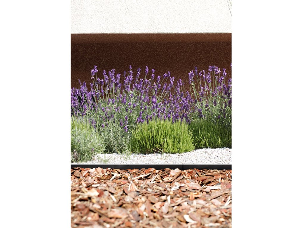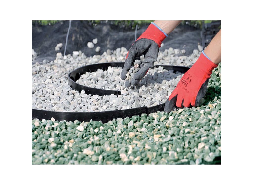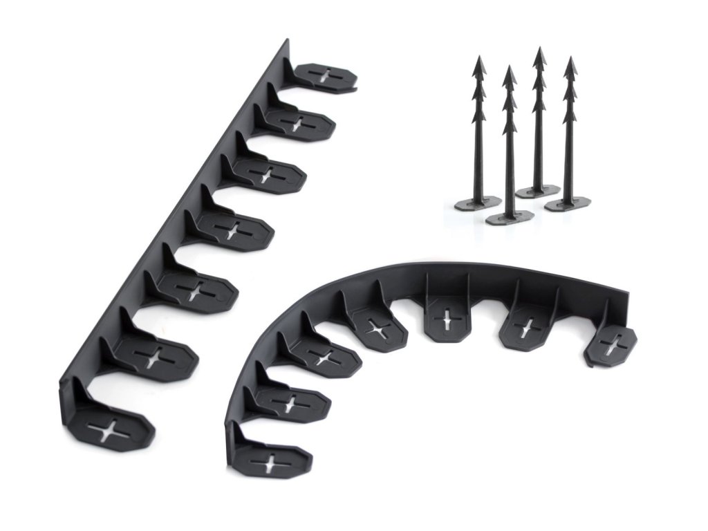 Neviditelný plastový obrubník je výborný pomocník při oddělování různých povrchů na zahradě, zamezuje prolínání materiálů a prorůstání oddénků trávníku. Lze jej různě tvarovat. Instaluje se pod rovinu terénu tak, aby byla vidět pouze šíře horní hrany (5 mm). Uchycuje se pomocí plastových hřebů, které jsou v dolní části opatřeny zpětnými zoubky proti vytržení. Obrubník je konstruován tak, aby po instalaci nijak nenarušoval ráz zahrady. Trávník můžeme sekat až k okraji oddělené plochy.