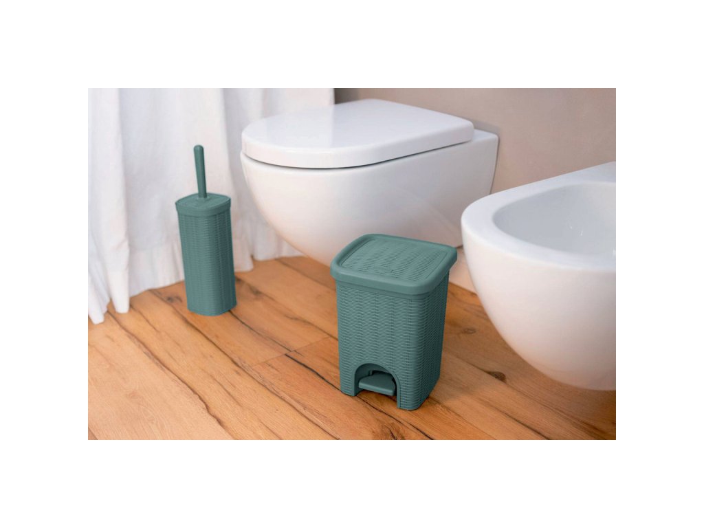 Stylový a praktický odpadkový koš do koupelny nebo na toaletu, vyrobený z recyklovaného plastu. Kompaktní rozměry a elegantní textura s povrchem připomínajícím tkaninu z něj dělají ideální doplněk do menších prostor. Výklopné víko zajišťuje pohodlné a hygienické používání. Koš je lehký, snadno omyvatelný a odolný vůči vlhkosti – skvělý pro každodenní použití v koupelně i na toaletě.