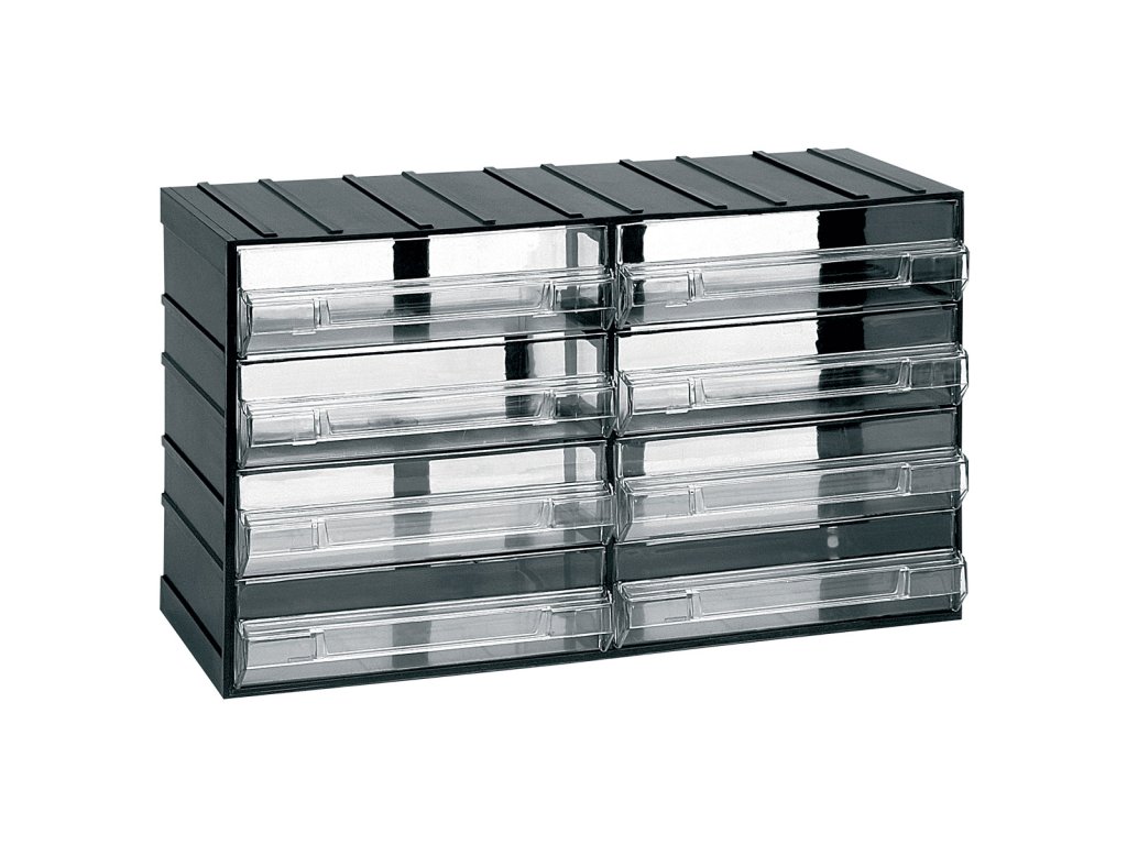 Zásuvky jsou plně výsuvné, průhledné, aby byl sortiment uvnitř rychle rozpoznán a navíc, je každá zásuvka opatřena prostorem na umístění popisu.
