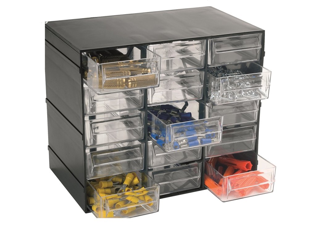 Máte spoustu spojovacího materiálů, který si potřebujete přehledně zorganizovat? Není nic jednoduššího, než si pořídit zásuvkový organizér ArtPlast HOBBY 15, který lze přimontovat na stěnu. Je vyrobený z vysoce houževnatého polystyrenu v černé barvě a obsahuje 15 zásuvek o rozměrech 7,2 x 3,4 x 13,7 centimetrů. Tyto zásuvky jsou vyrobeny z krystalů polystyrenu, což je pevný a super průhledný materiál. Ideální na uložení drobných spojovacích dílů, jako jsou šroubky, matice, těsnění, nýty a podobně. Jeho celkové rozměry jsou 22,8 x 19 x 14 centimetrů a nosnost činí 40 kilogramů. Navíc nevyžaduje montáž.