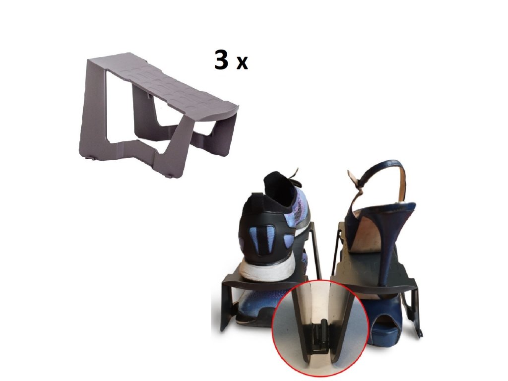 Set 3 stojanů na boty z šedohnědého polypropylenu, každý o rozměrech 210 x 147 x 140 mm (d x v x š)