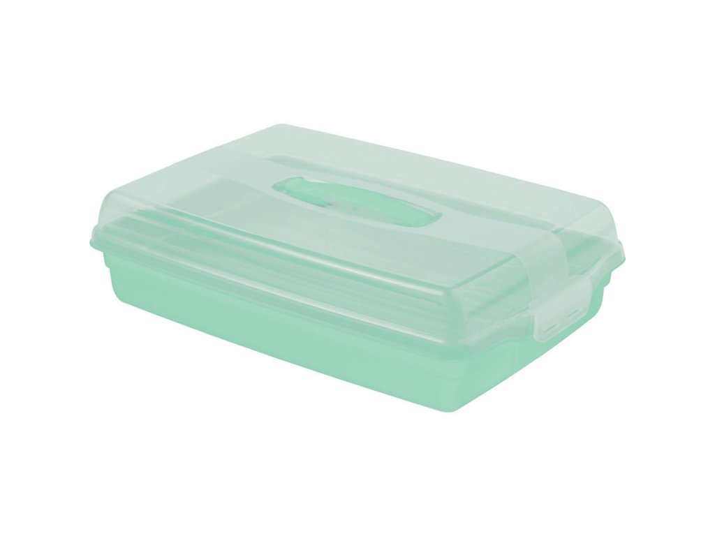 Praktický obdélný box, v kterém skladujete a přepravíte koláč nebo obložené chlebíčky. Praktické držadlo umožňuje snadno ji přenášet a použít na příklad na pikniku. Ideálně se hodí na kuchyňskou linku, do ledničky nebo do skříně. Díky boxu si všechno pečivo a svačinky zachovají svěžest déle. Výrobek je opatřen certifikátem povolujícím kontakt s potravinami.