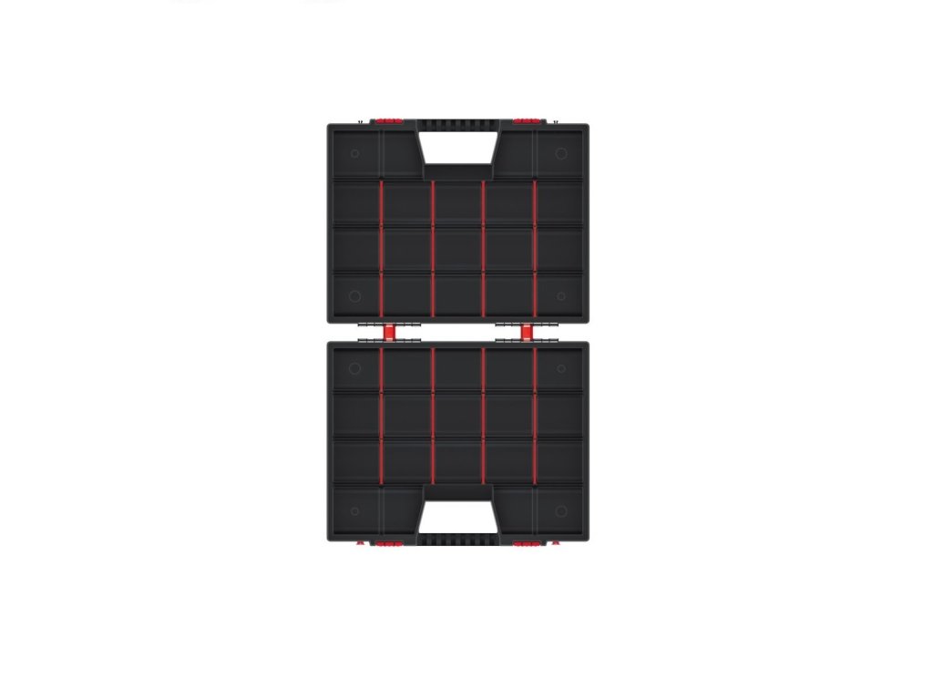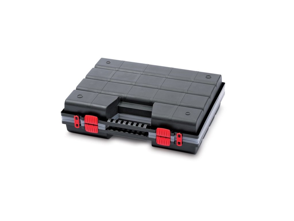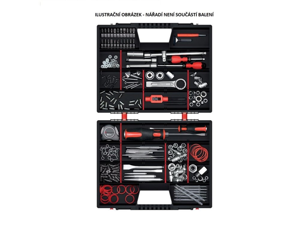 Přenosný organizér na šroubky, matice, podložky a podobné drobnosti. Organizér je vytvořený tak, aby bylo možné využít obě strany a tím vytváří kufřík. Má přihrádky, které jsou od sebe oddělené. Je opatřen klipy v červeném provedení pro jeho snadné a bezpečné uzavření. Můžete ho snadno přenést pomocí rukojeti, která se po uzavření vytvoří.