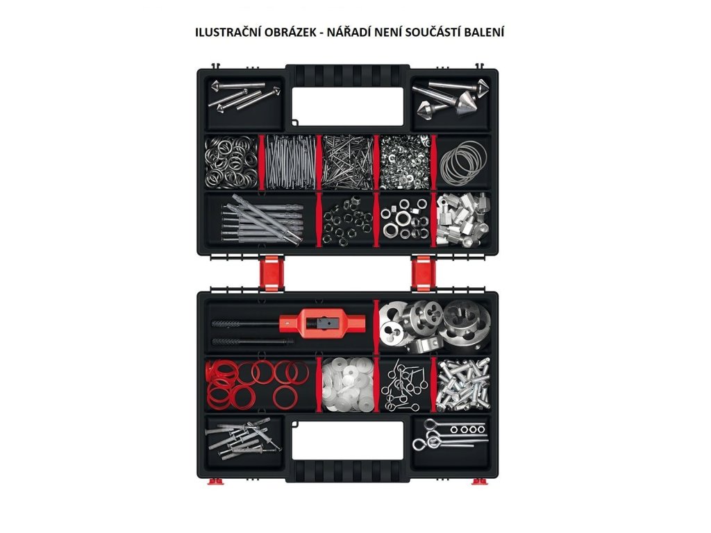 Přenosný organizér na šroubky, matice, podložky a podobné drobnosti. Organizér je vytvořený tak, aby bylo možné využít obě strany a tím vytváří kufřík. Má přihrádky, které jsou od sebe oddělené. Je opatřen klipy v červeném provedení pro jeho snadné a bezpečné uzavření. Můžete ho snadno přenést pomocí rukojeti, která se po uzavření vytvoří.