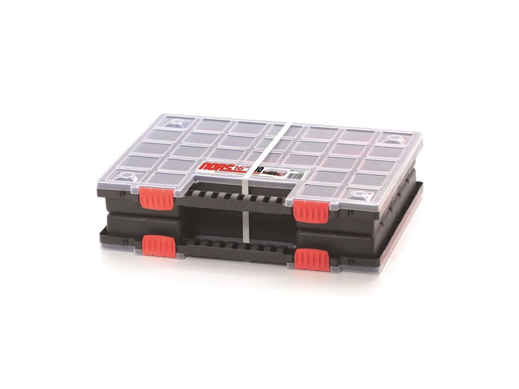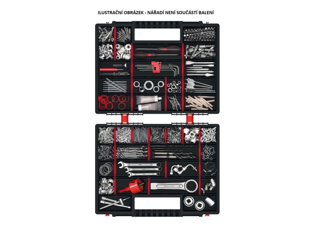 Přenosný organizér na šroubky, matice, podložky a podobné drobnosti. Organizér je vytvořený tak, aby bylo možné využít obě strany a tím vytváří kufřík. Má přihrádky, které jsou od sebe oddělené. Je opatřen klipy v červeném provedení pro jeho snadné a bezpečné uzavření. Můžete ho snadno přenést pomocí rukojeti, která se po uzavření vytvoří.