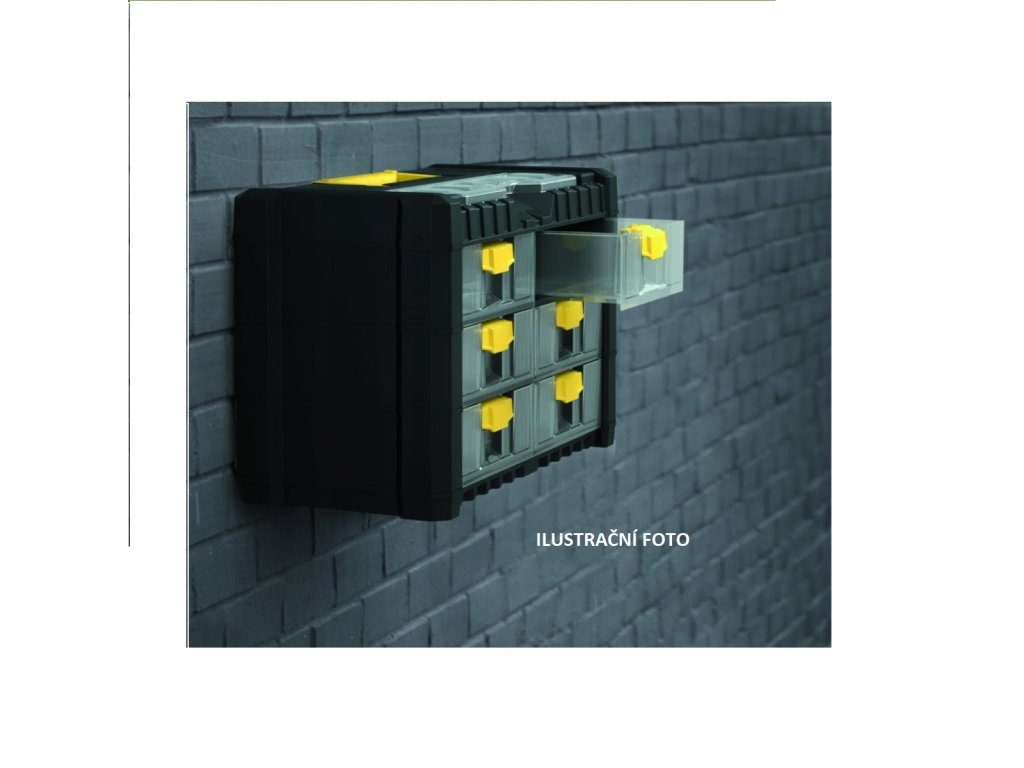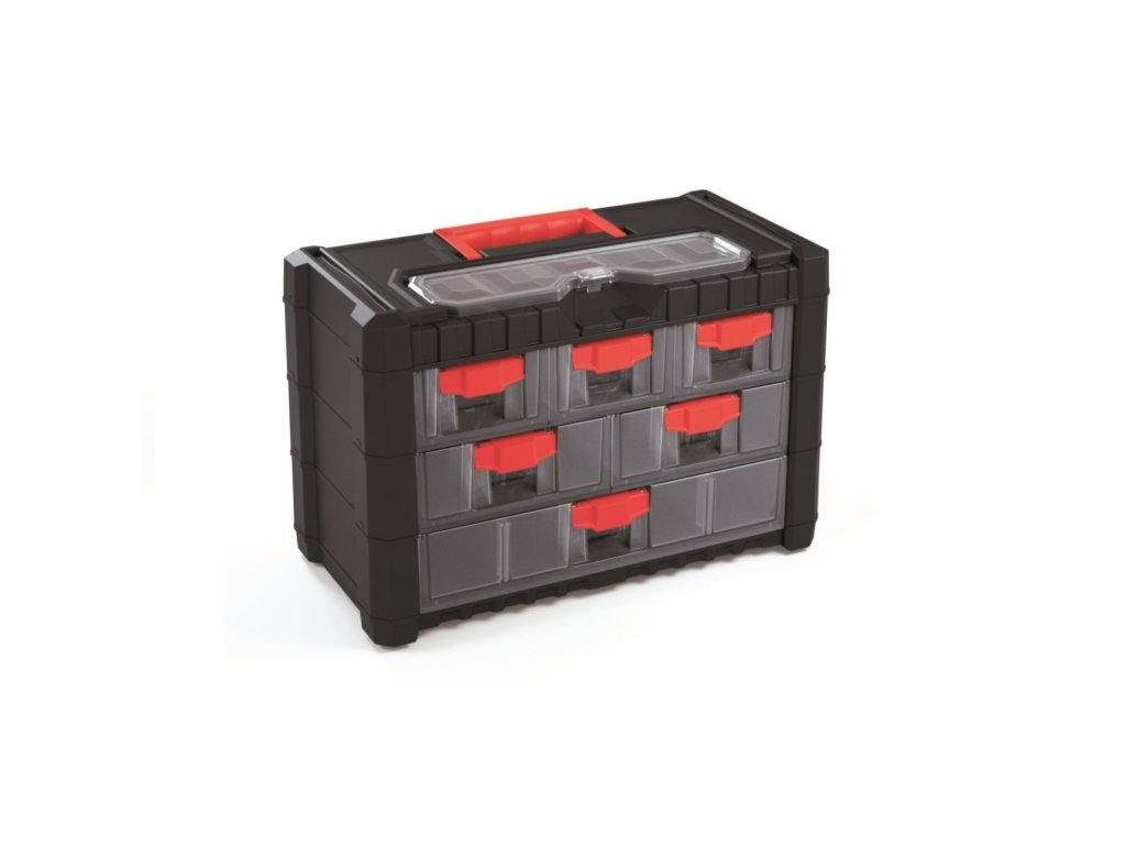 *rozměr 400 x 200 x 260 mm *barva černá s transparentními boxy a červenými úchyty *box má 3 různé velikosti zásuvek (3x 185x100x65 mm, 2x 185x160x65 mm a 1x 185x325x65 mm) *je opatřen i organizérem na horní části