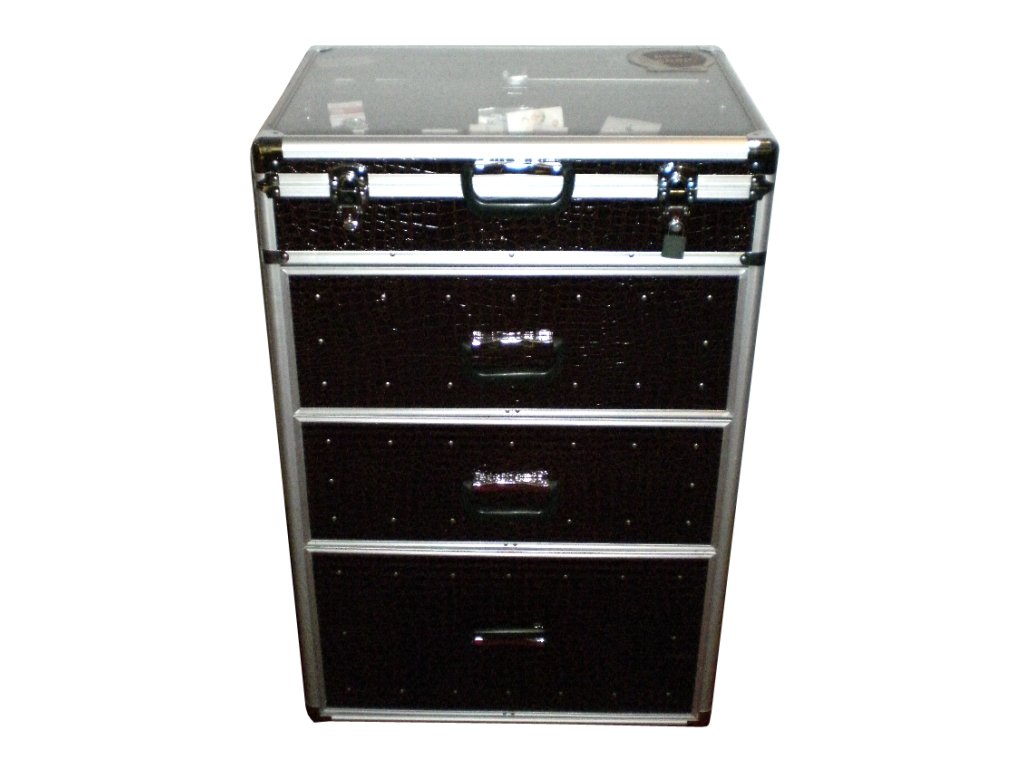 Jedinečný pomocník pro zvýšení Vašeho obratu. Prodejní stánek je vyroben z luxusní imitace krokodýlí kůže a hliníkového rámu. Až 100 kg zboží se dá uložit do 3 hlubokých zásuvek sloužících jako zásoba vzorků nebo zboží, které vystavíte v horní prosklené vitríně, vystlané sametem.