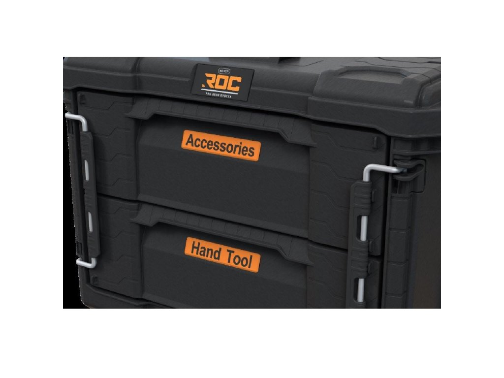 Box je vybaven 2 prostornými zásukami s nosností až 10 kg, které poskytují dostatek prostoru na vaše nářadí a další dílenské pomůcky. Jejich celková kapacita činí 28 litrů. Na přední straně naleznete oranžové popisovací štítky, díky nimž vždy budete vědět co máte ve které zásuvce uložené. Jedna zásvuka je navíc vybavena rozdělovacími přepážkami pro ještě lepší organizaci drobnějších součástkech. Zásvuky jsou ošetřeny bezpečnostními zarážkami zabraňujícími jejich nechtěnému vysunutí.