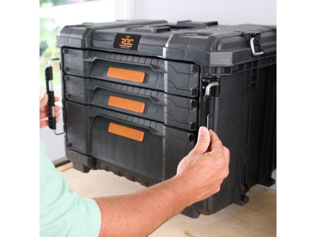 Objevte dokonalého pomocníka pro každého kutila. Uspořádejte si svou dílnu a nářadí díky boxu na nářadí ROC Pro Gear 2.0 značky Keter. Box obsahuje 3 zásuvky 3 2 mělké a 1 hlubší, čím poskytuje dotatek prostoru pro uložení nejrůznějšího nářadí a součástek. Celková nosnot činí 20 kg. Zásuvky jsou na přední straně vybaveny oranžovými štítky k nadepsání jejich obsahu. Bezpečnostní zarážky brání nechtěnému otevření zásuvek.