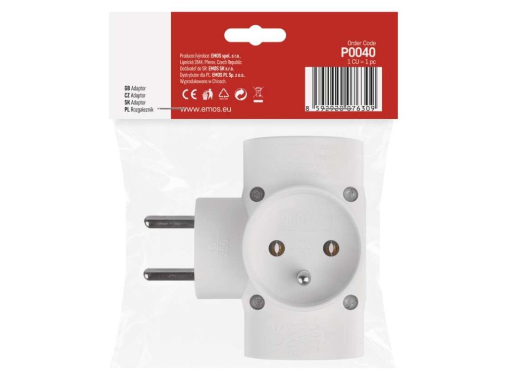 Rozbočovací zásuvka (adaptor) slouží k rozbočení zásuvky na více zásuvek. 250 V~ / 10 A max. 4× zásuvka 2P+PE.