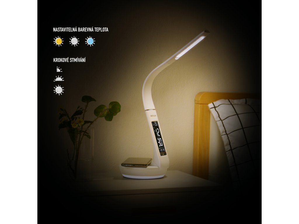 RETLUX RTL 203 – moderní stmívatelná LED stolní lampa v elegantní bílé, která spojuje kvalitní osvětlení s pohodlím bezdrátového nabíjení Qi. Úsporný 6W světelný zdroj zajistí příjemné, rovnoměrné světlo pro práci, studium i čtení – a váš telefon se mezitím nabíjí přímo na základně.