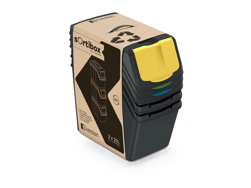 Koše mají odklápěcí chlopně a pohodlné rukojeti. Sada obsahuje samolepky s označením odpadu. Nádoby lze použít k oddělení, například: papír, sklo, plast.