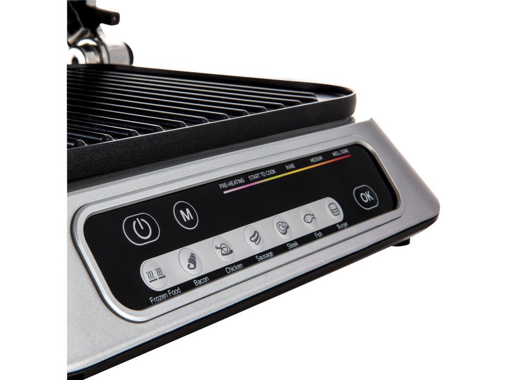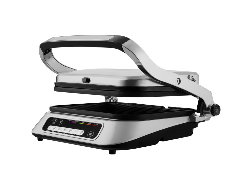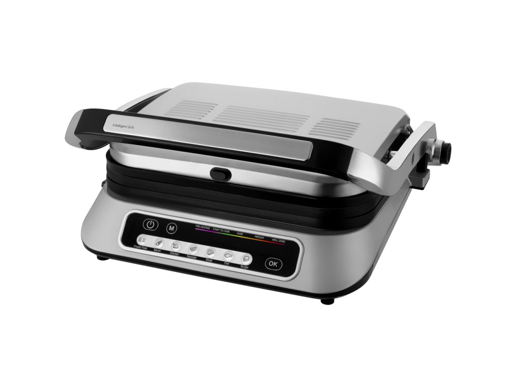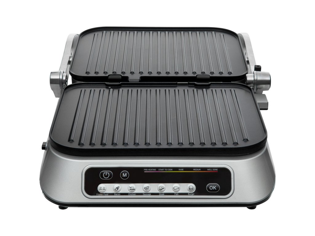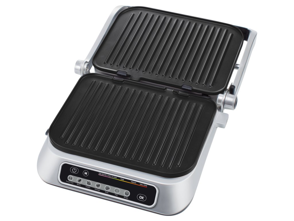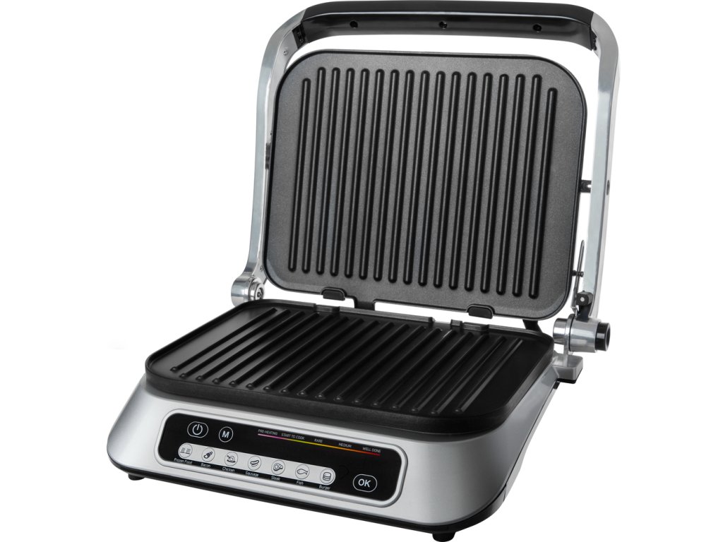 Příkon 2 100 W, rozměry grilovací desky 31 × 25 cm, 7 programů, nepřilnavé desky, protiskluzové nožky, automatická regulace teploty