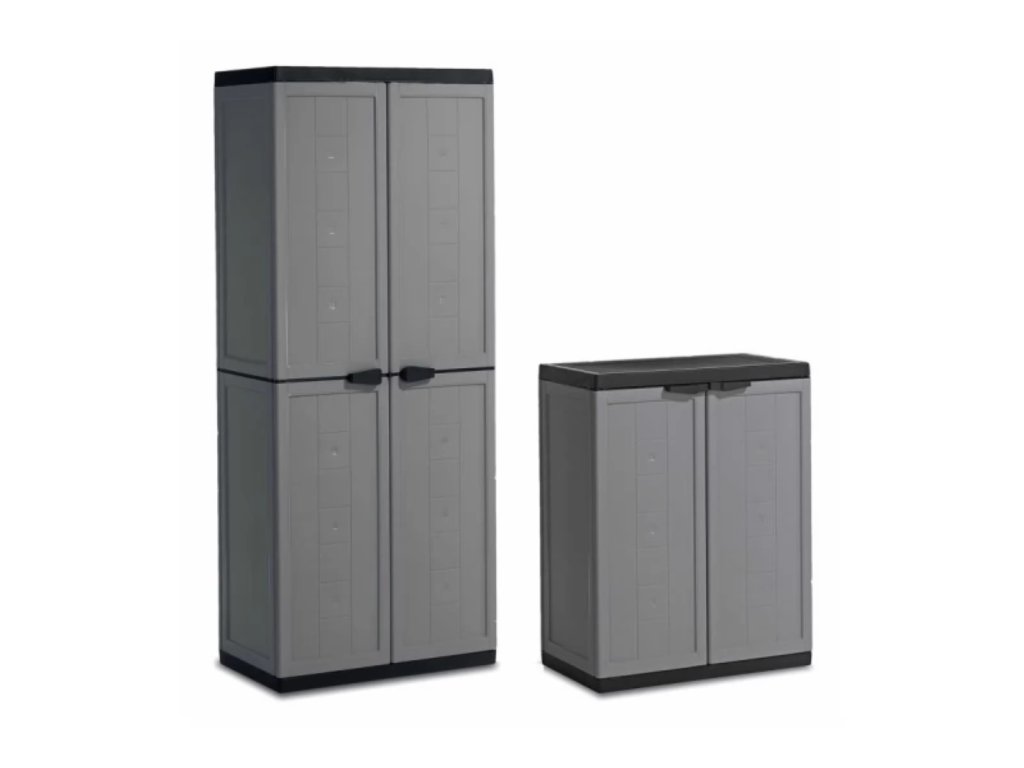 Potřebujete uskladnit nářadí, papíry, dokumenty nebo jen upomínkové předměty? Pak je zde pro vás set plastových skříní JOLLY v šedé barvě od značky KIS. Vysoká skříň o rozměrech 68 x 39 x 166 cm je vybavena 3 variabilními policemi s nosností až 15 kg. Nízká skříň o rozměrech 68 x 39 x 85 cm disponuje jednou variabilní policí o nostnosti až 15 kg. Tyto skříně se hodí do sklepa, garáže, dílny nebo pracovny, pohodlně do nich uložíte své věci. Jejich montáž je velice jednoduchá a zvládne ji opravdu každý již během několika minut.