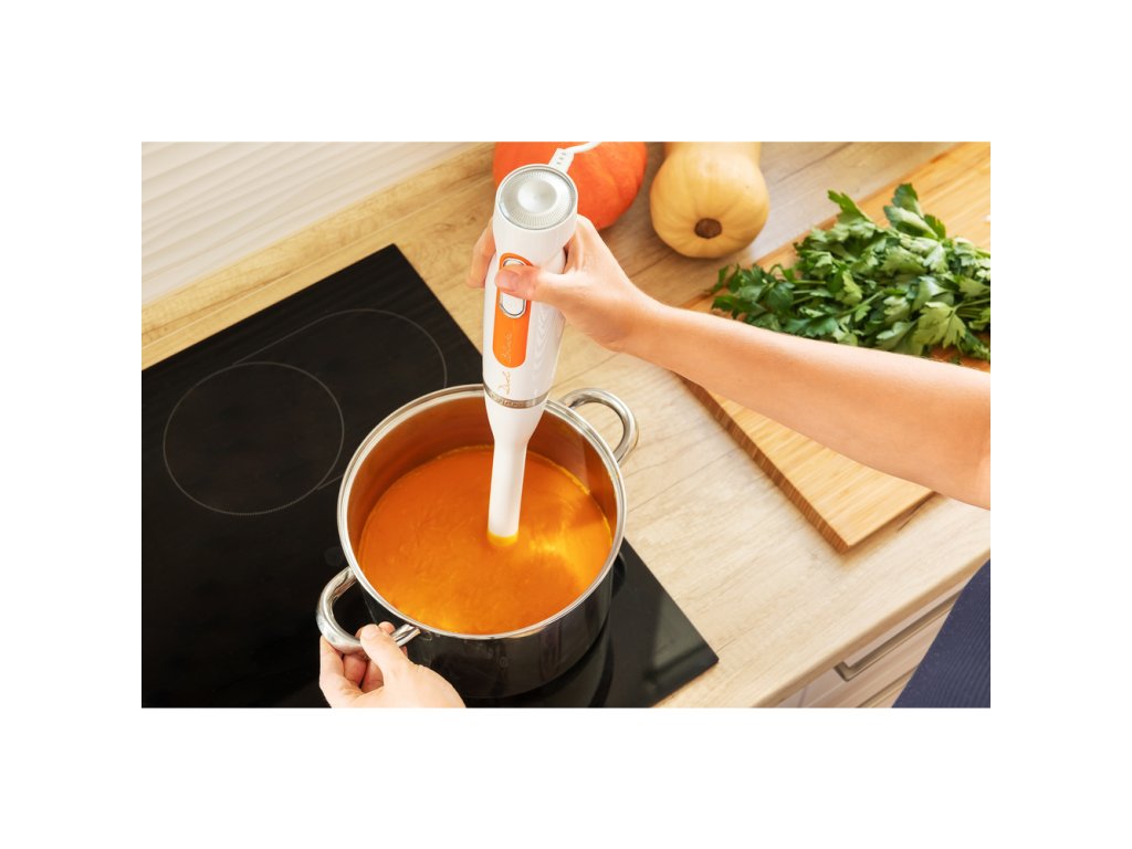 - Praktické tipy: mixujte přímo v hrnci, vždy ponořte nože celé do surovin pro perfektní výsledek a menší rozstřik.