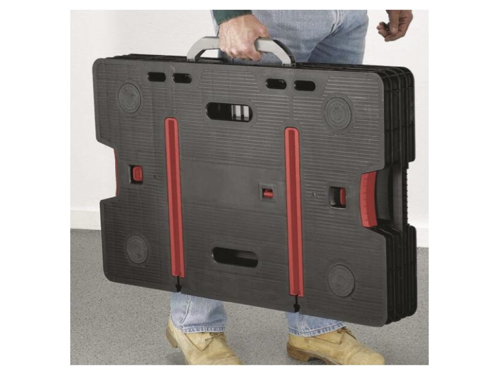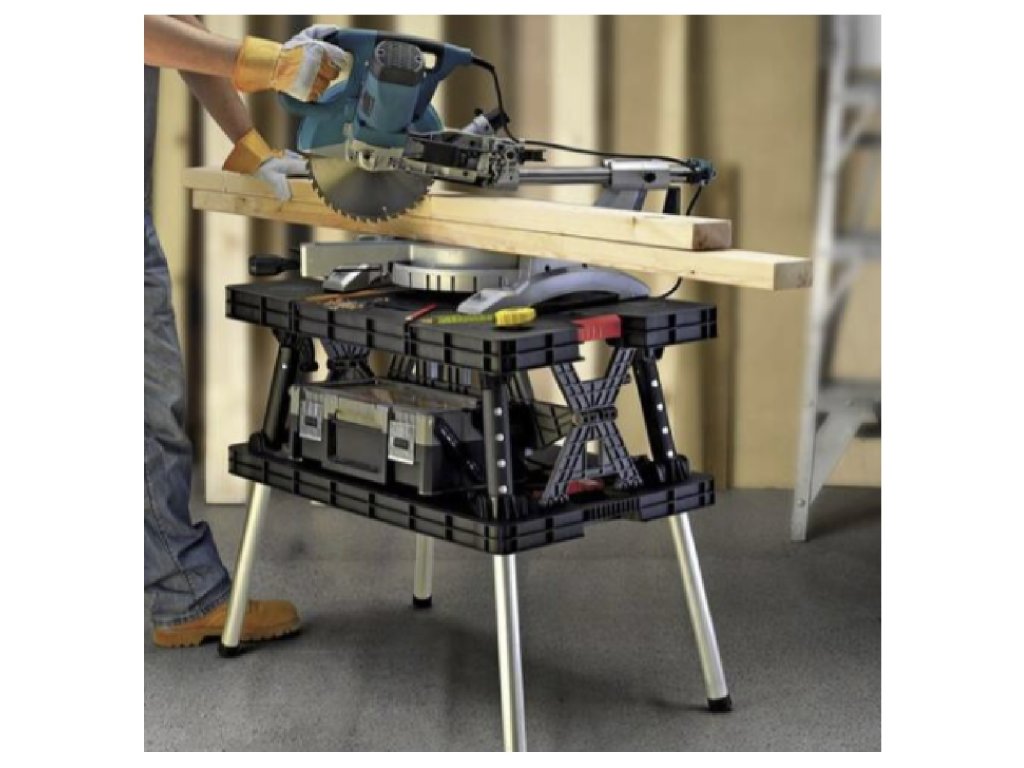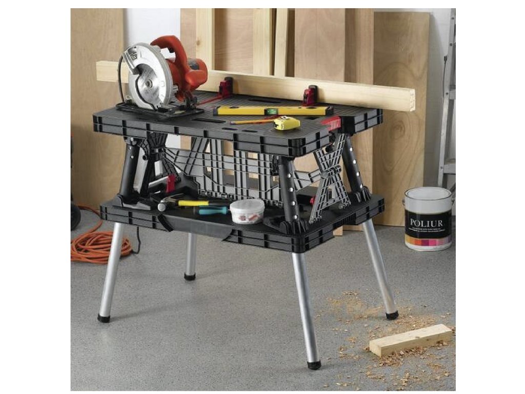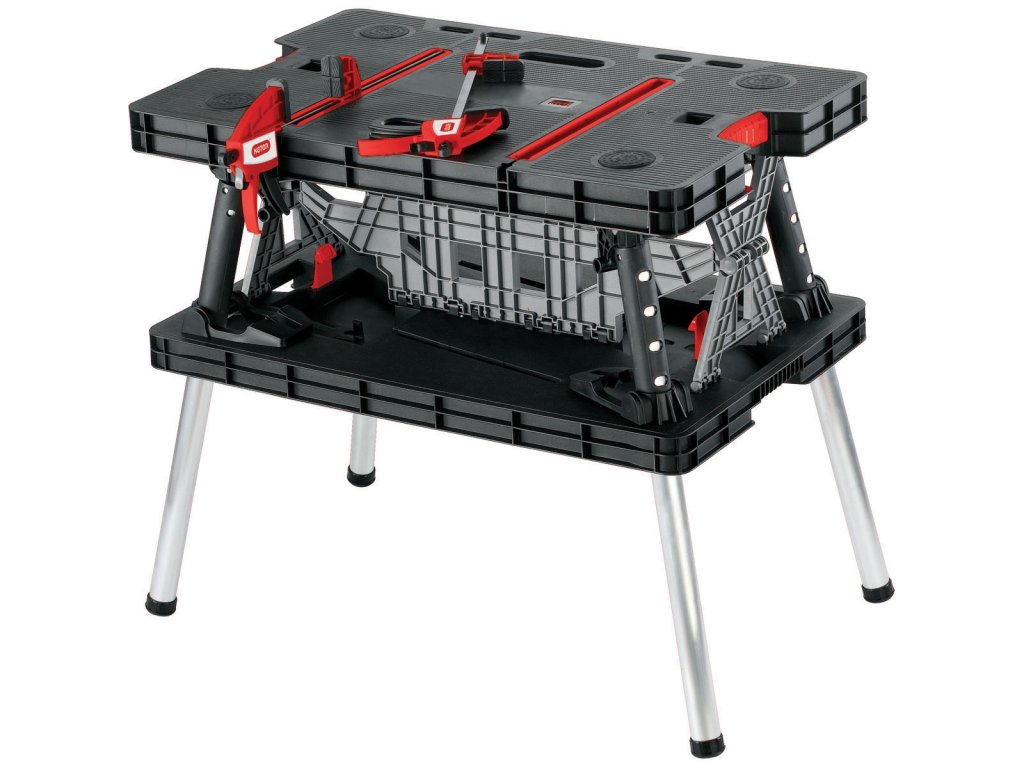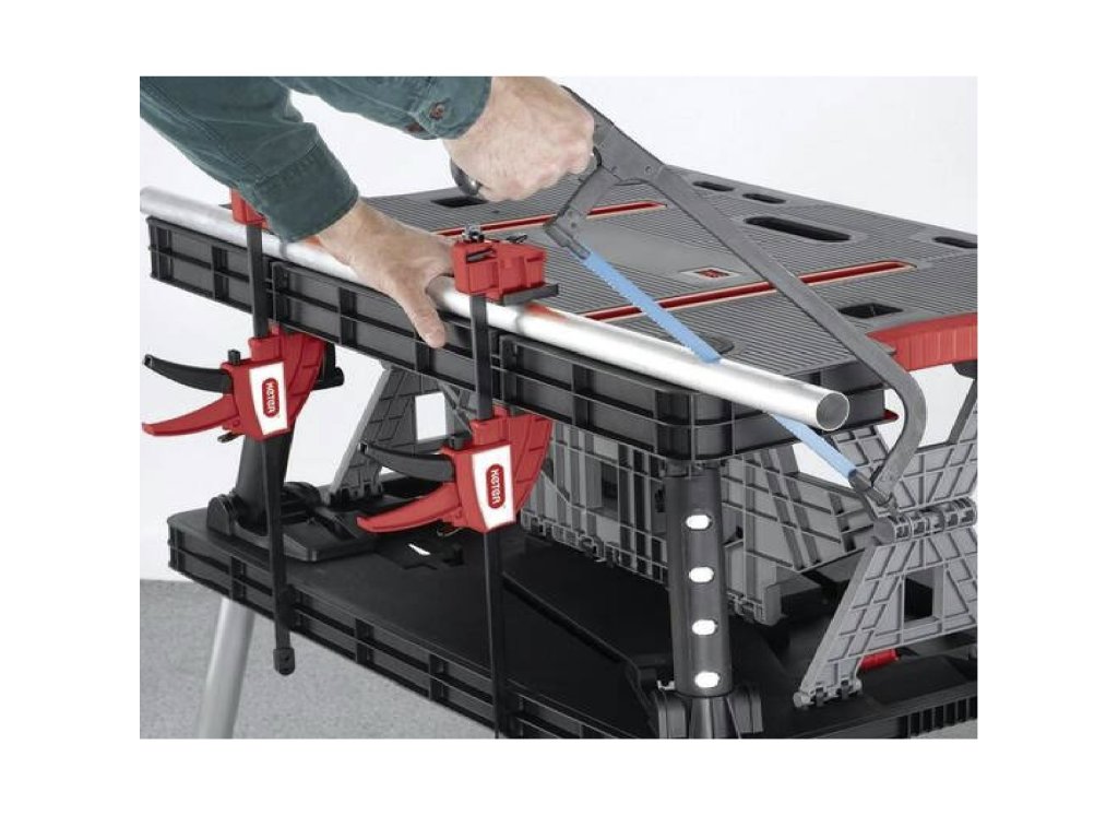 Praktický přenosný stůl umožňuje práci na různých místech. Výrobek disponuje speciálním systémem, který umožňuje rychlé rozkládání a skládání, což výrazně usnadňuje kutilství. Velká pracovní plocha stolu, odolnost do 453 kg / 1000 lbs zajišťují, že na něm můžete vykonávat také složité práce. V balení s výrobkem jsou dvě svorky 30 cm/12” Clamps, které zajišťují stabilitu pracovního povrchu.