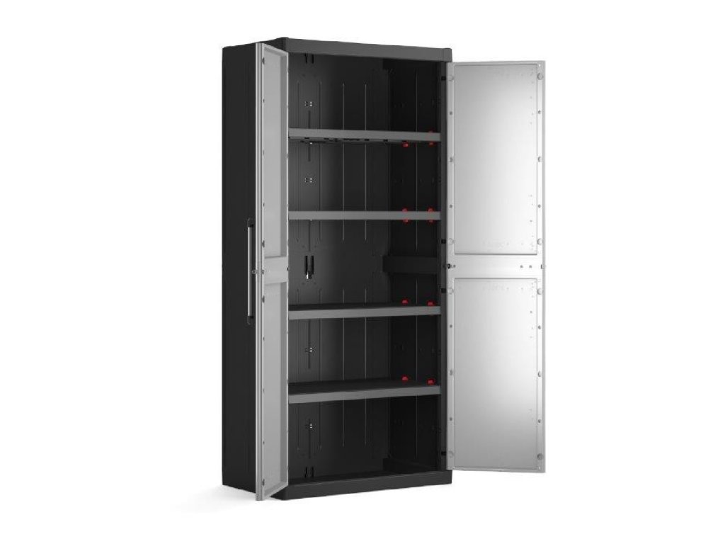 Skříň je vyrobena z velmi odolného polypropylenu, který odolá styku s oleji nebo rozpouštědly. Materiál nepohlcuje vlhkost ani pachy, proto je vhodný i do prostor s vyšší vlhkostí, je odolný proti plísním, omyvatelná a snadno se udržuje. Polypropylen rovněž vykazuje vyšší odolnost proti nárazům. Skříň je uvnitř vybavena 4 policemi s nastavitelnou výškou. Nosnost každé police je 25 kg. Skříň je připravena na možnost uzamčení.