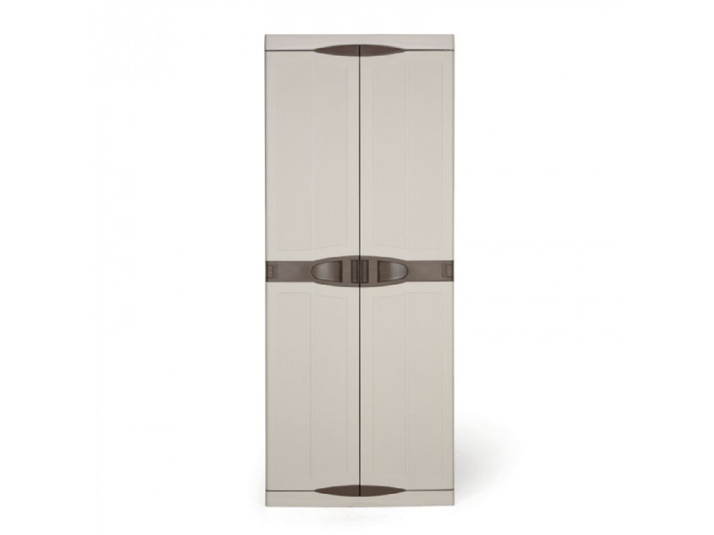Skříň je vyrobena z velmi odolného polypropylenu, který odolá styku s oleji nebo rozpouštědly. Materiál nepohlcuje vlhkost ani pachy a je proto vhodný i do prostor s vyšší vlhkostí, je odolný proti plísním, omyvatelný a snadno se udržuje. Polypropylen vykazuje rovněž vyšší odolnost proti nárazům. Skříň je uvnitř dělená a vybavena 4 policemi, které je možno přestavovat a přizpůsobit tak požadovanou výšku. Nosnost každé police je 25 kg. Skříň je připravena na možnost uzamčení.