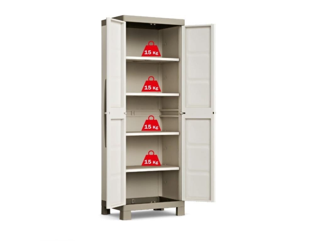 Skříň nabízí 4 nastavitelné police, každou s nosností až 15 kg, což poskytuje flexibilní možnosti uspořádání pro uložení různých předmětů od domácích potřeb po zahradní nářadí. Uzamykatelný systém dveří zajišťuje, že všechny vaše cennosti zůstanou bezpečně uloženy a chráněny (zámek není součástí balení).