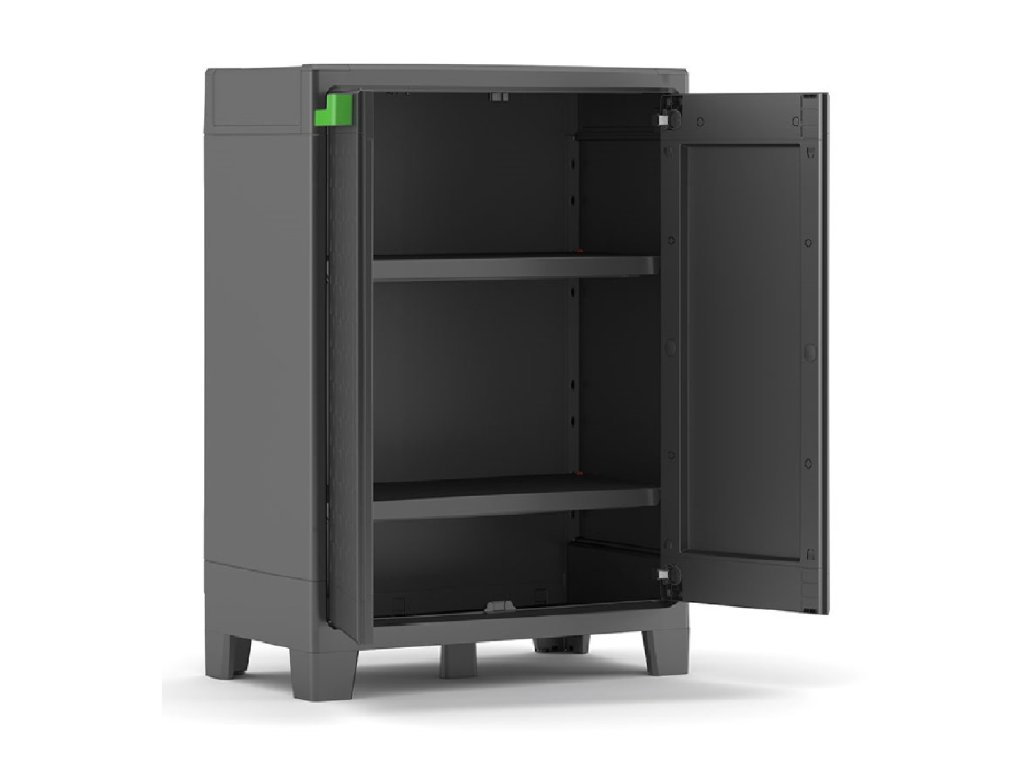 Skříň v tmavošedém provedení KIS Moby low cabinet je vyrobena z velmi odolného a kvalitního plastu. Její stabilitu zajišťují 4 nohy s možností vodorovného nastavení. Díky tomu ji postavíte i na nerovném terénu. Také zajistíte snadný úklid pod skříní. Pátá noha je určena pro zvýšení nosnosti dna skříně. Uvnitř je vybavena dvěma variabilně nastavitelnými policemi. Kdy nosnost každé police je do 30 kg. Má praktické rukojeti s bezpečnostním uzavíráním pro snadné a široké otevření. Umožňuje připevnění zámku pro ochranu uložených věcí.