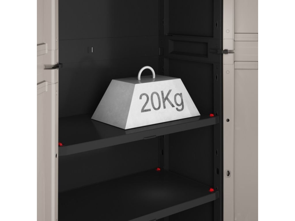 Skříň obsahuje 4 nastavitelné police s nosností až 20 kg, které Vám umožní flexibilně uspořádat prostor podle vašich potřeb. Navíc je opatřena zesíleným dnem díky dvěma středovým nožičkám, které zajišťují extra stabilitu a odolnost i při plném zatížení.