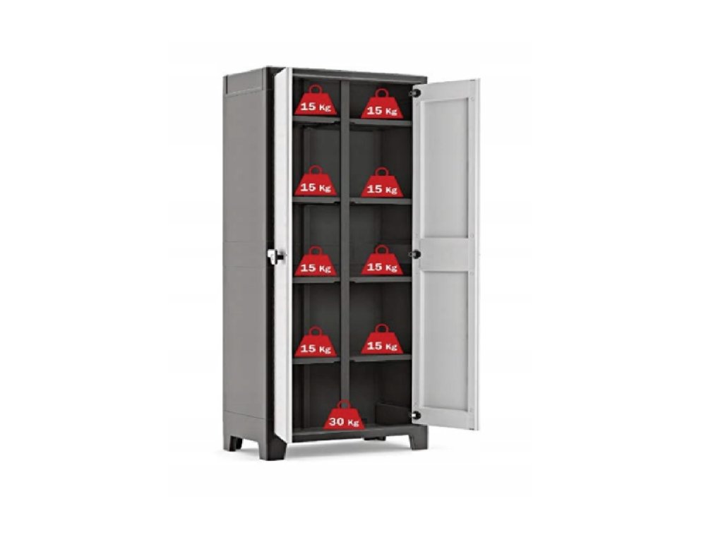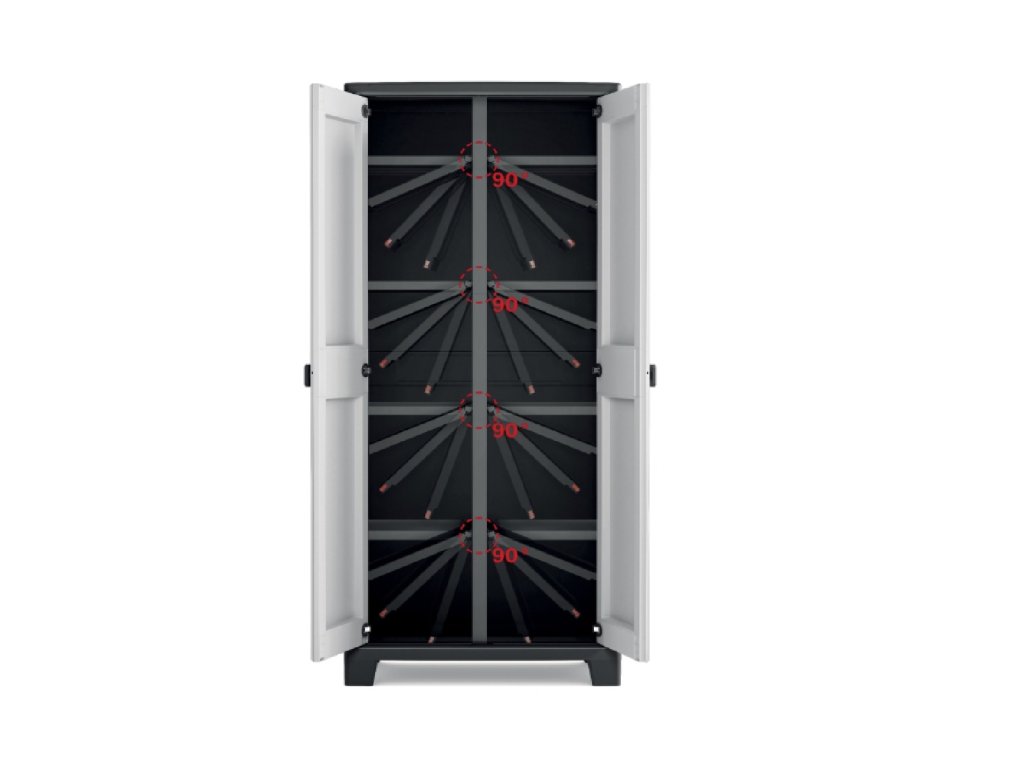 Koupí této skříně získáte univerzální prostor pro ukládání věcí a to i v exteriéru díky její odolnosti proti vodě. Navíc můžete jednotlivé police sklopit o 90 ° a vytvořit prostor přímo na míru ukládaných věcí. Nerovný povrch není problémem, protože má výškově nastavitelné nohy.